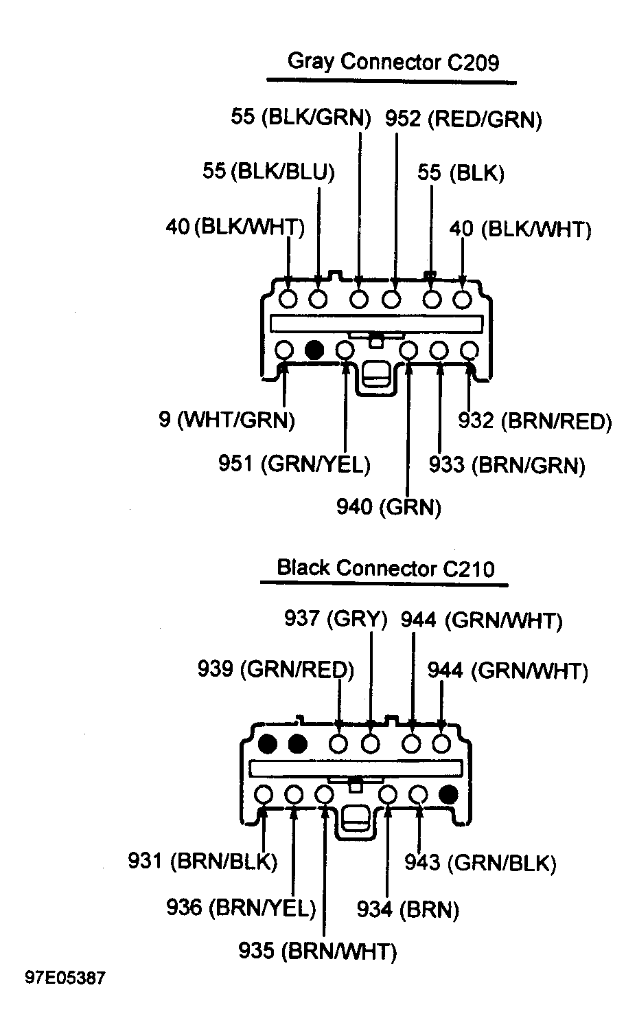 Check clockspring wiring and connector for pinched and/or chafed wiring at main wiring harness at base of steering column. If wiring is damaged, repair wiring as necessary and go to step 7). If wiring is OK, disconnect clockspring connector from main wiring harness at base of steering column. Connect Air Bag Simulator (105-R0009) to main wiring harness in place of clockspring connector. Measure resistance between ground and C210-11 (Green/White wire) of diagnostic monitor. See Figure . If terminal No. 11 is still shorted to ground, repair short to ground in either circuit No. 937 (Gray wire), 938 (Red wire), 939 (Green/Red wire), 944, 944A, 944B, or 944D (Green/White wire). Check for potential location where shorts may occur. When short has been serviced, go to next step. If terminal No. 11 is not shorted to ground. Replace clockspring. See CLOCKSPRING under REMOVAL & INSTALLATION. Go to next step. - Locate Shorted Air Bag Sensor Wiring
