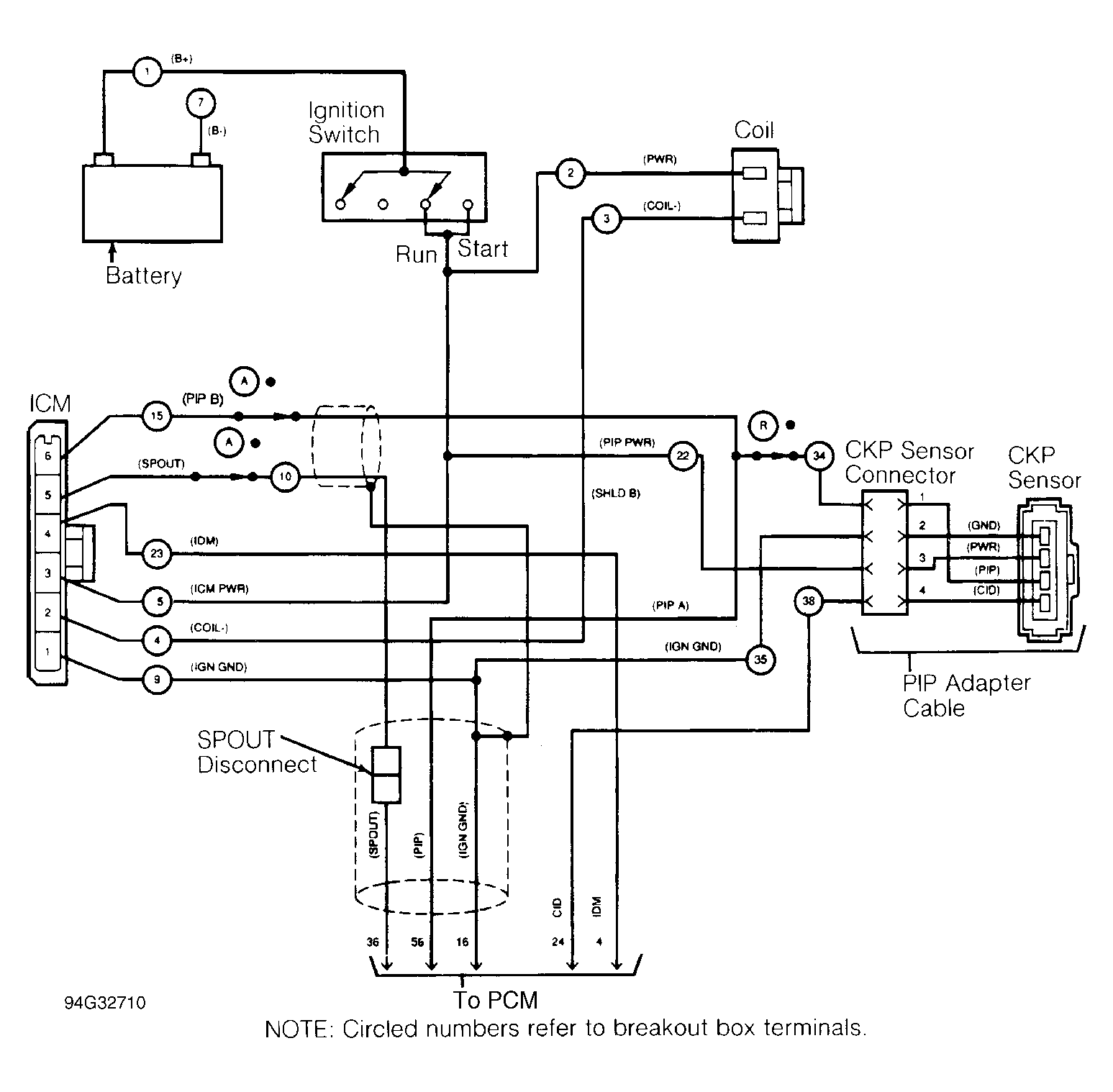 1. Connect Test Equipment  Turn ignition off. Connect DI Diagnostic Cable (007-00097) to EEC-IV Breakout Box (T83L-50-EEC-IV), negative battery terminal and ICM. See Figure. Leave B+ lead disconnected. Ensure PIP OPEN/NORMAL/SPOUT OPEN switch is in NORMAL position. Use DI overlay on breakout box. Disconnect PCM and go to next step.