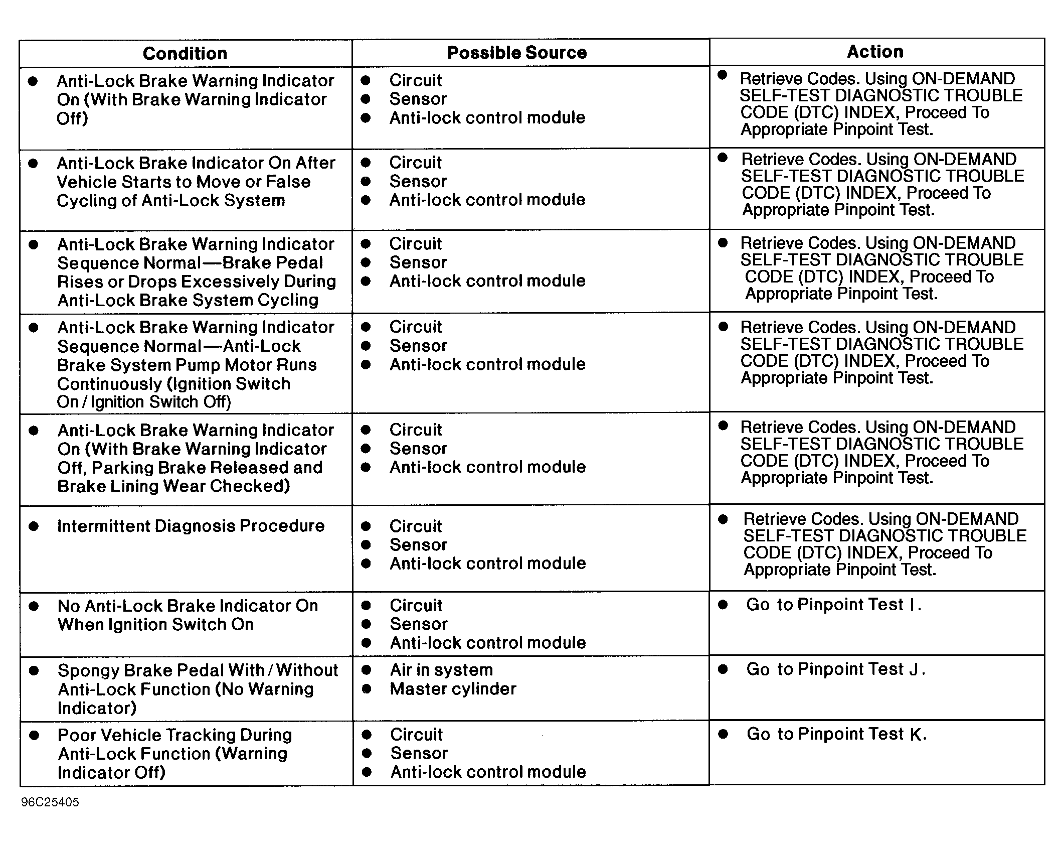 Testing sequence should be as follows: PRETEST CHECKS, ON-DEMAND SELF-TEST using ON-DEMAND SELF-TEST DIAGNOSTIC TROUBLE CODE (DTC) INDEX table and PINPOINT TESTS A through K. If symptoms are present but codes cannot be retrieved, perform ABS QUICK CHECK and WARNING LIGHT SYMPTOM SEQUENCE CHECK. See Figure and Figure .
