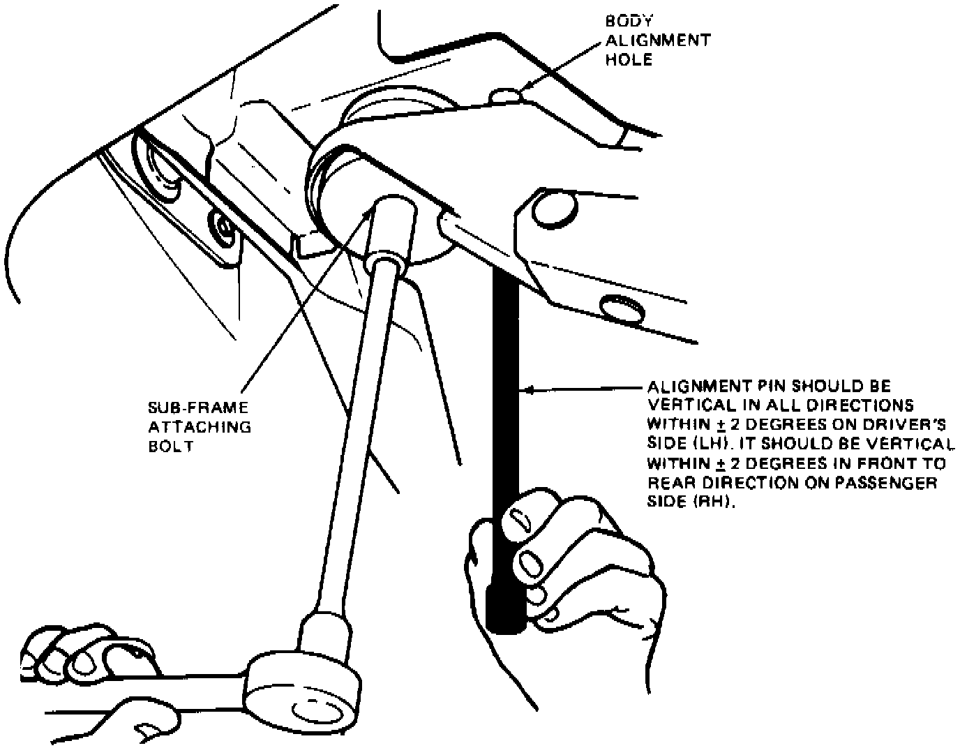 b. Install a 3/4 inch outside diameter pipe or similar tool into lefthand front subframe and body alignment holes.