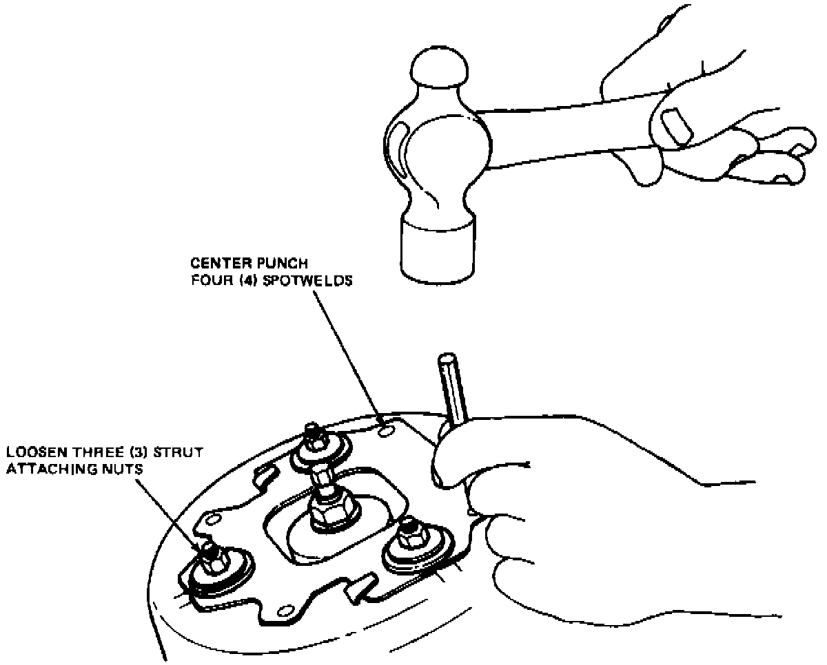 2. Center punch spot welds on both strut alignment plates, then loosen strut attaching nuts.