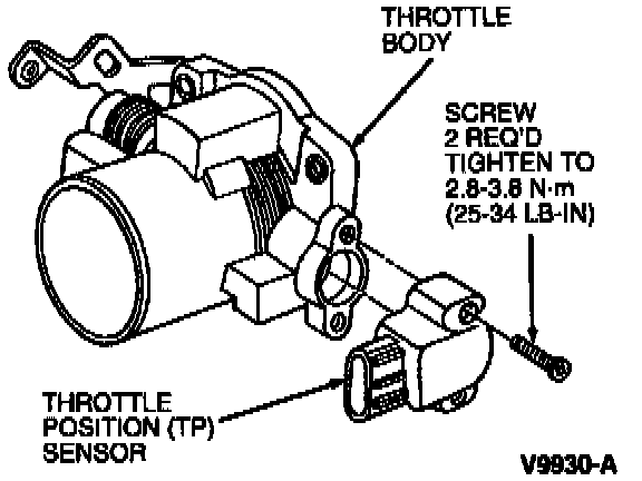 2. Secure TP sensor to throttle body with two retaining screws. Tighten to 2.8-3.8 Nm (25-34 lb in).