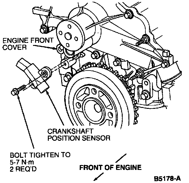 2. Position crankshaft position sensor and install retaining bolts. Tighten to 5-7 Nm (44-61 lb in).