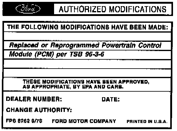 Obtain an Authorized Modifications Decal and list the date, dealer number, and summary of modifications performed. Select a prominent place adjacent to the Vehicle Emission Control Information Decal suitable for installing the Authorized Modifications Decal. Clean the area, install the decal, and cover it with a clear plastic decal shield.