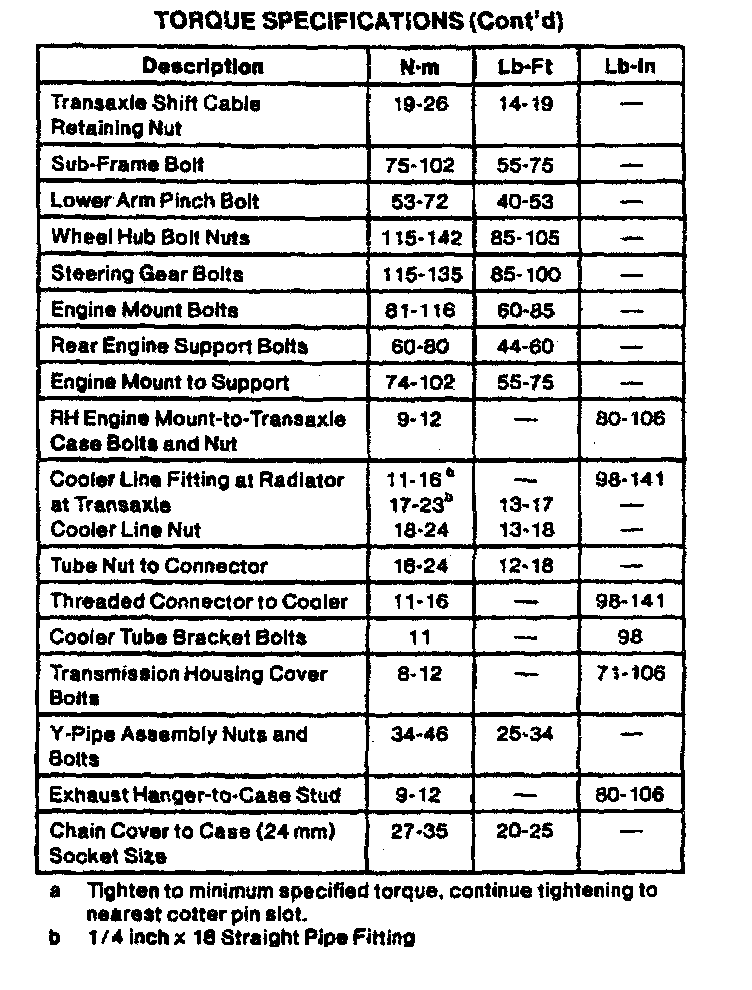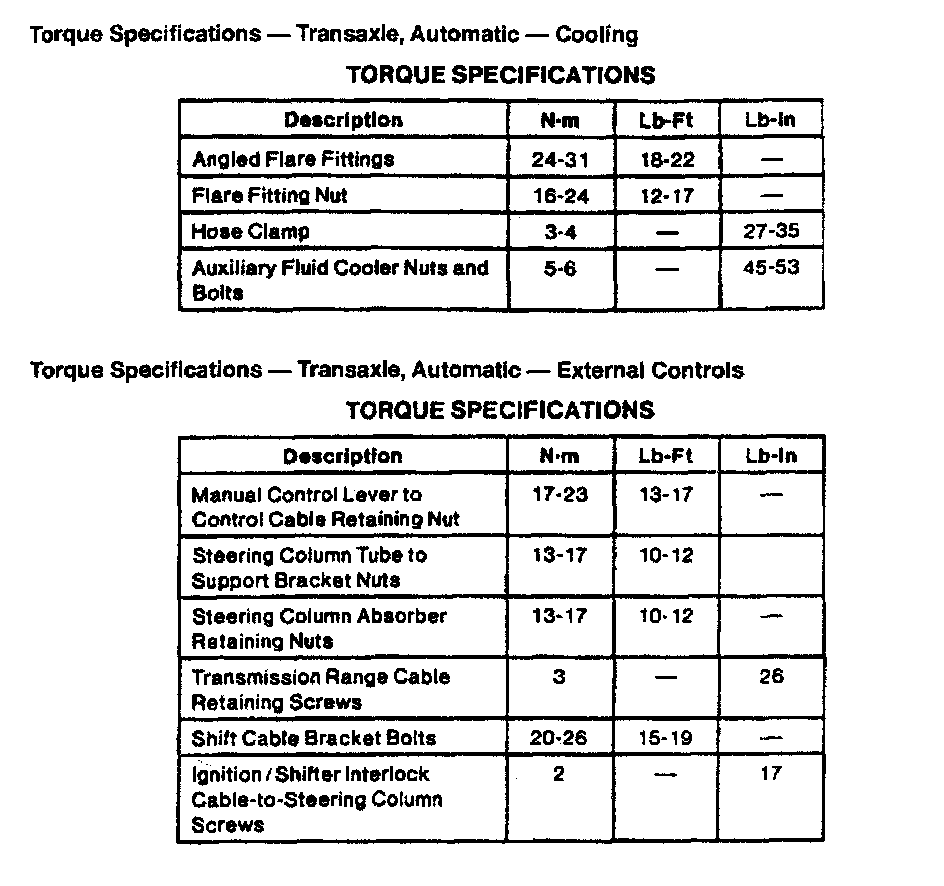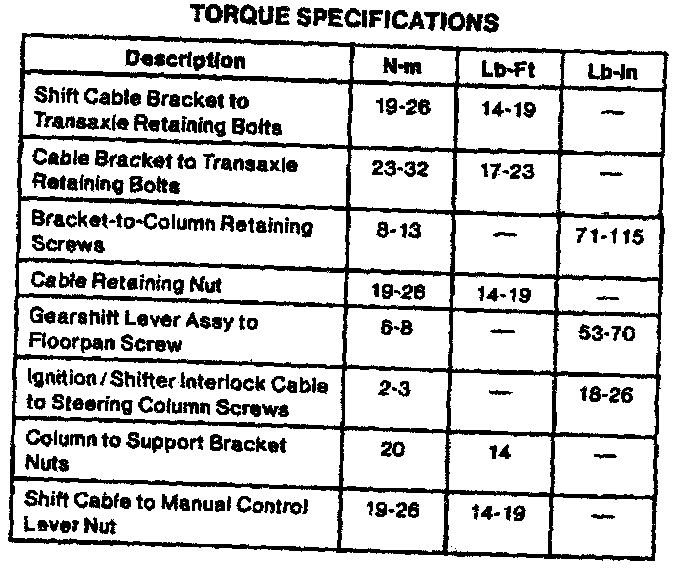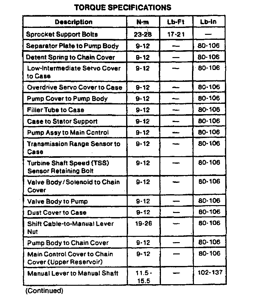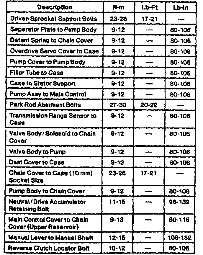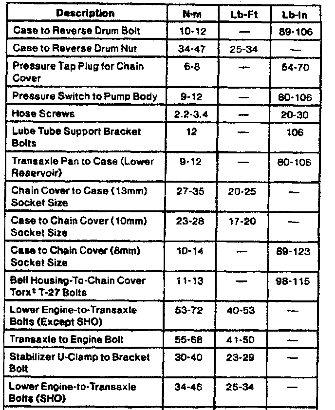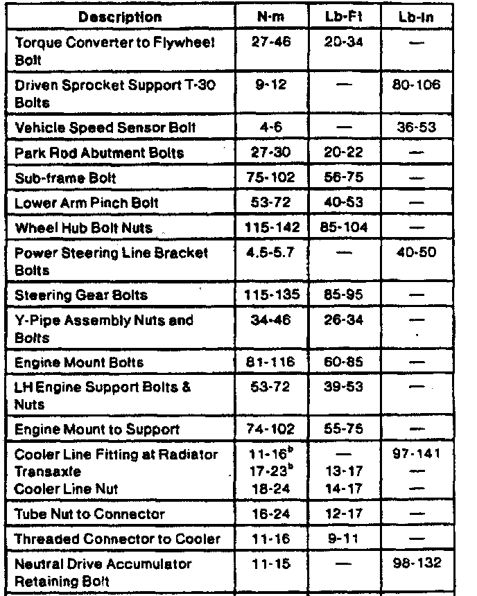 Home >> Ford >> 1996 >> Taurus V6-182 3.0L >> Repair and Diagnosis >> Specifications >> Mechanical Specifications >> Automatic Transmission/Transaxle >> System Specifications >> A/T Torque Data >> AX4N 4-SPD A/T