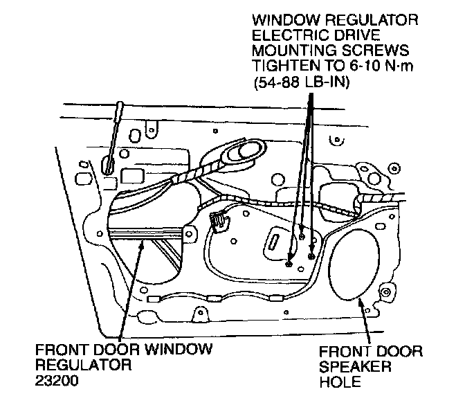 2. Connect the window regulator electric drive wires at the connector and cycle the door window glass to make sure gear engagement. After the gears are engaged, tighten the three window regulator electric drive retaining screws to 6-10 N.m (54-88 Lb-In).