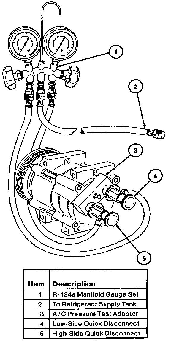 11. Slowly remove the gauge set hoses from the A/C Pressure Test Adapter T94P-19623-E. (Allow the refrigerant to escape from the A/C compressor.)