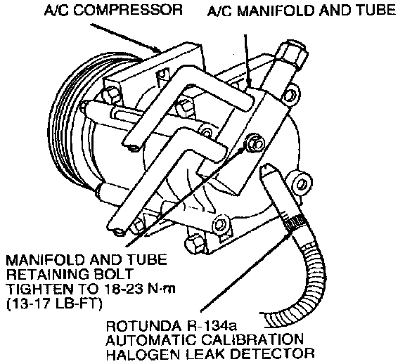 5. If a leak is found at the A/C manifold and tube and the manifold retaining bolt is tightened to 18-23 N.m (13-16 Lb-Ft), install new manifold O-ring seals. Then, repeat the leak test.