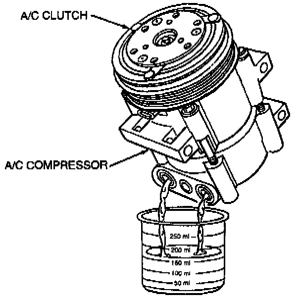 6. Remove the old A/C compressor and drain the oil into a calibrated container.