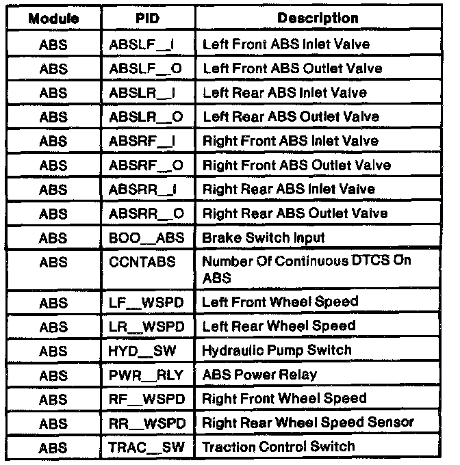 Anti-Lock Brake Control Module PID Index