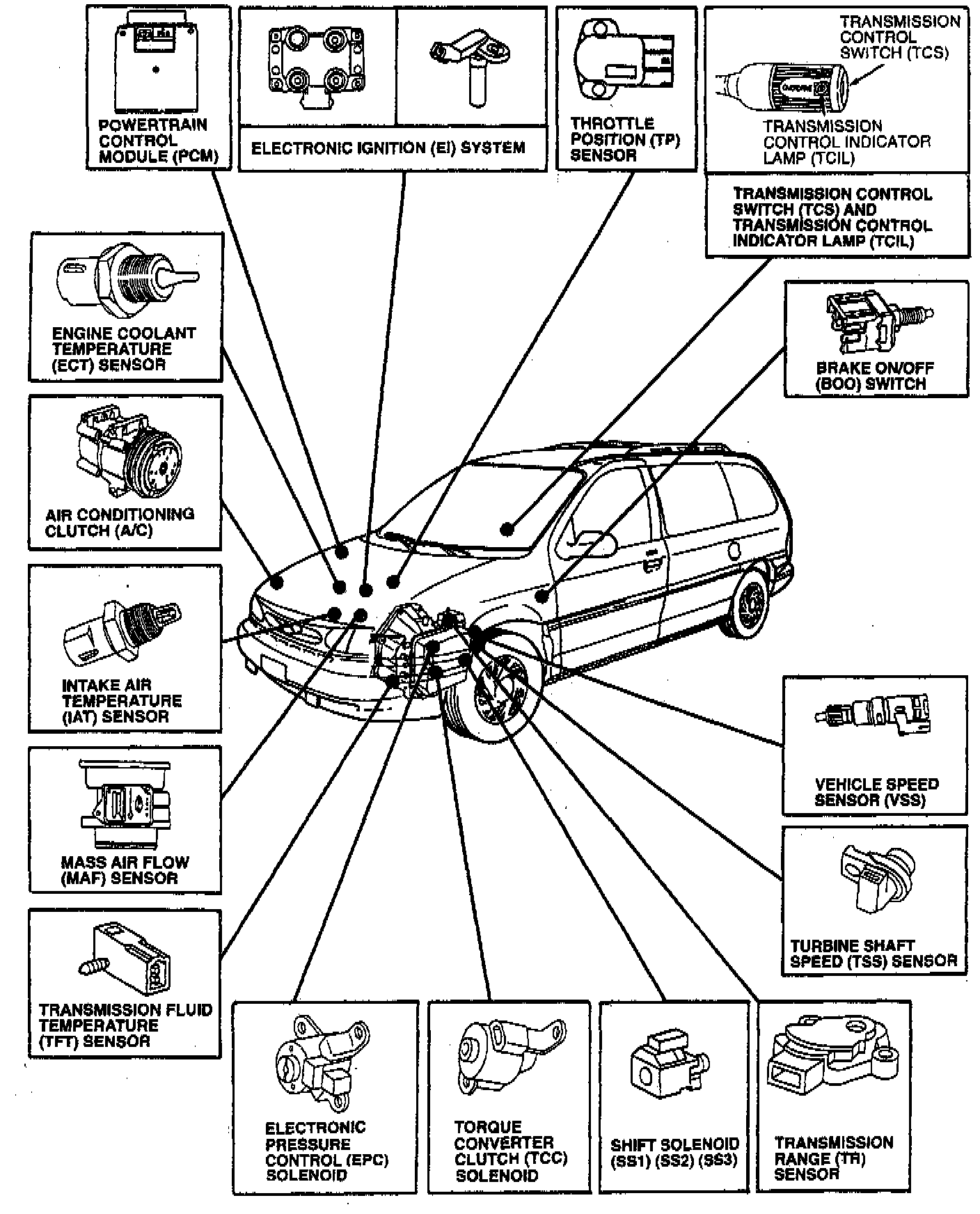 Some input signals come from the engine-related sensors, for example, Mass Air Flow (MAF) sensor and Engine Coolant Temperature (ECT) sensor to give the powertrain control module an idea of the load and climate under which the engine is operating. Some other inputs are based on driver inputs, such as accelerator pedal position which is related to the powertrain control module by the Throttle Position (TP) sensor. Still other inputs are provided by the transaxle itself, from sensors such as the Vehicle Speed Sensor (VSS), Transmission Range (TR) sensor (controlled by the placement of the transaxle range selector lever) and the transmission fluid temperature sensor.