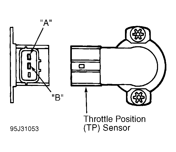 1. Turn ignition off. Disconnect TP sensor wiring harness connector. Rotate throttle to wide open position. Measure resistance between terminals "A" and "B". See Fig 1 . Resistance should be about 5 ohms.