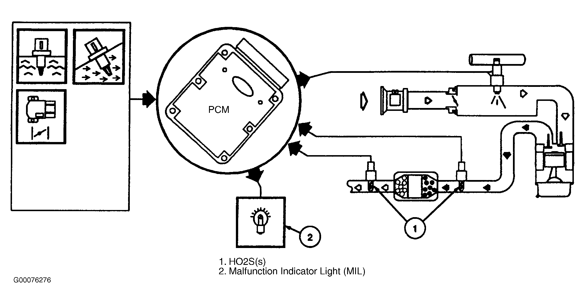 The catalyst efficiency monitor is an on-board strategy designed to monitor and determine when a catalytic converter has deteriorated below the minimum level of effectiveness in its ability to control exhaust emissions. This monitor relies mainly on the front and rear oxygen sensors to infer catalyst efficiency based upon oxygen storage capacity. The front and rear oxygen sensor voltages are integrated under specified conditions for the purpose of calculating a rear to front oxygen sensor voltage ratio. After the integrated voltage ratio is calculated, it is compared against a minimum emission threshold value for a healthy catalyst. If the rear-to-front integrated voltage ratio is less than the emission threshold, the catalyst has failed. As catalyst efficiency degrades, its ability to store oxygen declines and it will begin to have a lower rear to front integrated voltage ratio and low HC efficiencies. In general, as catalyst efficiency decreases, the integrated rear-to-front voltage ratio decreases. Inputs from the Engine Coolant Temp (ECT) sensor, Intake Air Temp (IAT) sensor, and Throttle Position (TP) sensors are required to enable the federal test procedure catalyst monitor. To aid in monitor descriptions. refer to illustration. See Figure.