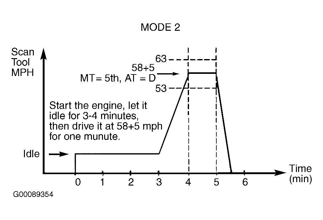 - With transmission in DRIVE (A/T) or 5th gear (M/T), accelerate the vehicle to approximately 53-63 MPH (90-116 kph) and maintain that speed for one minute.