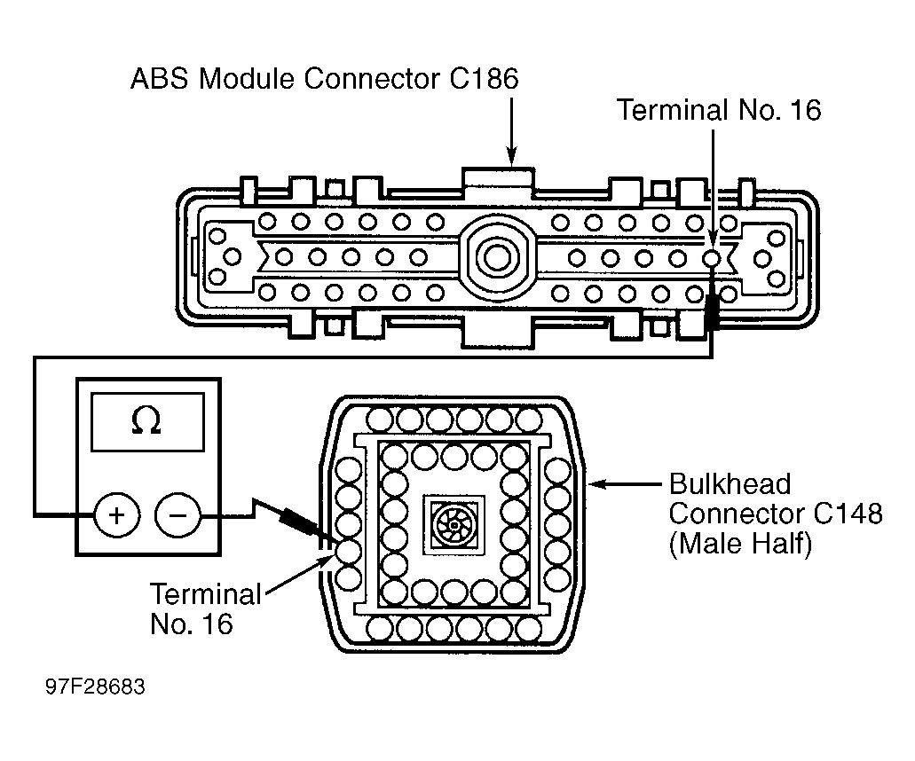 2. Measure resistance of Light Blue/White wire between ABS module connector C186, terminal No. 16 and Data Link Connector (DLC), terminal No. 7. If resistance is less than 5 ohms, replace ABS module and retest system. If resistance is more than 5 ohms, go to next step.