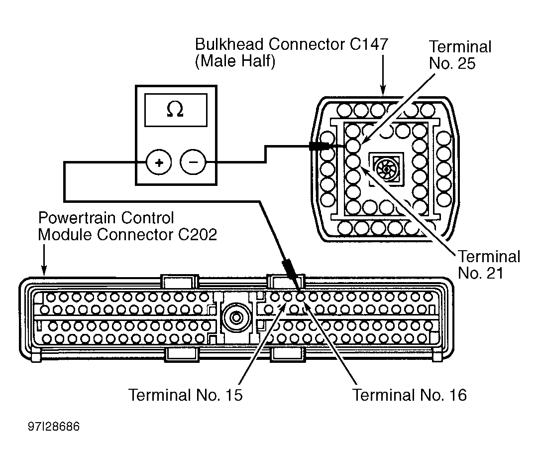 5. Measure resistance of Tan/Orange wire between PCM connector C202, terminal No. 16 and male half of bulkhead connector C147, terminal No. 21. Measure resistance of Pink/Light Blue wire between PCM connector C202, terminal No. 15 and male half of bulkhead connector C147, terminal No. 25. See Fig 1. If resistance is less than 5 ohms, repair connectors and/or appropriate wire between female half of bulkhead connector C147 and DLC and retest system. If resistance is more than 5 ohms, repair connectors and/or appropriate wire between male half of bulkhead connector C147 and PCM connector and retest system.