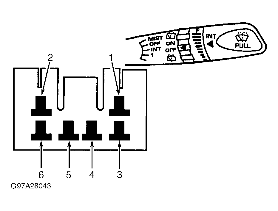 - Disconnect wiper/washer switch connector. See WIPER/WASHER SWITCH under REMOVAL & INSTALLATION. Measure resistance between wiper/washer switch connector terminal No. 3 and specified switch terminals. See FRONT WIPER/WASHER SWITCH TEST TABLE. See Fig 1 .