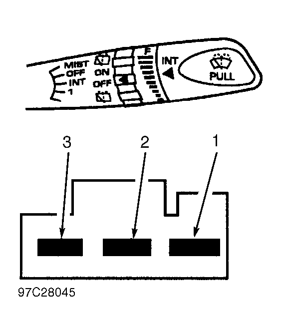 - Turn ignition off. Disconnect rear wiper/washer switch 3-pin connector. See WIPER/WASHER SWITCH under REMOVAL & INSTALLATION. Check resistance between switch connector terminal No. 3 and specified terminals. See REAR WIPER SWITCH TEST TABLE. See Fig 1 .