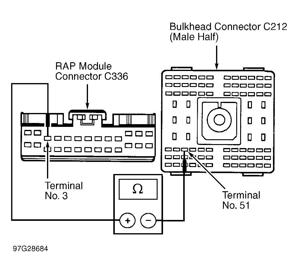 4. Measure resistance of Light Blue/White wire between RAP module connector C336, terminal No. 3 and bulkhead connector C212 (male half), terminal No. 51. See Fig 1. If resistance is less than 5 ohms, repair open in Light Blue/White wire between bulkhead connector C212 (female half) and DLC and retest system. If resistance is more than 5 ohms, repair open in Light Blue/White wire between RAP module connector C336 and bulkhead connector C212 and retest system.