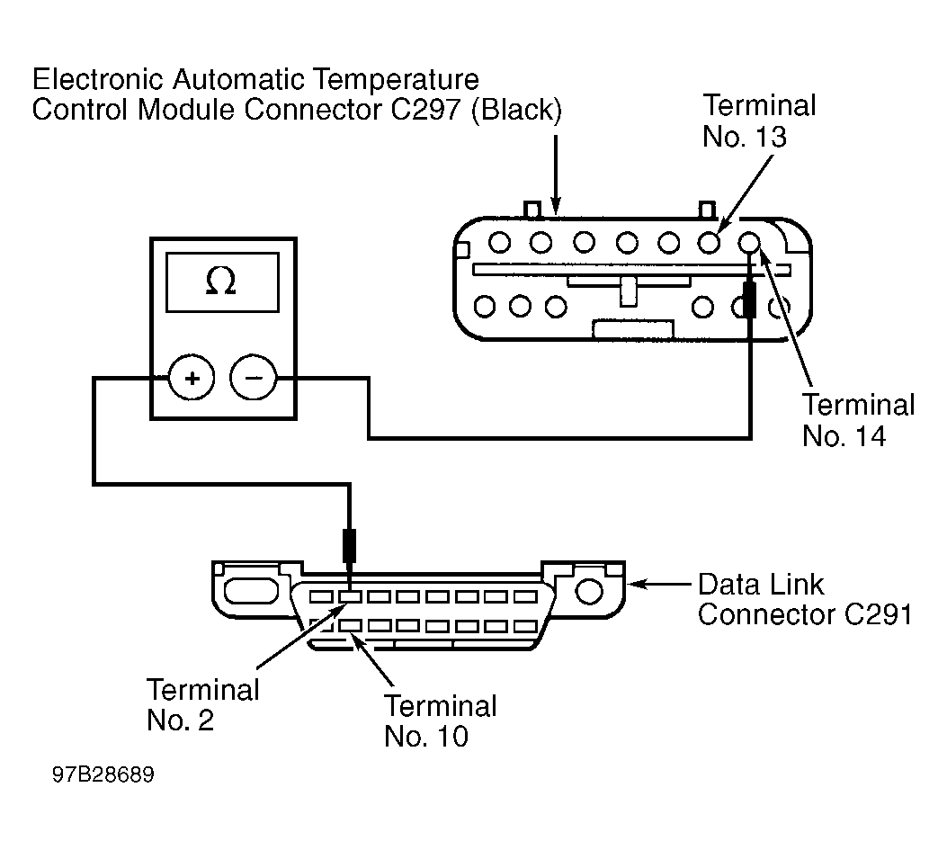 4. Disconnect Black Electronic Automatic Temperature Control (EATC) module connector C297 located behind center of instrument panel. Measure resistance of Tan/Orange wire between EATC module connector C297, terminal No. 14 and DLC, terminal No. 2. See Fig 1. If resistance is less than 5 ohms, go to next step. If resistance is more than 5 ohms, repair open in Tan/Orange wire between EATC connector and DLC and retest system.