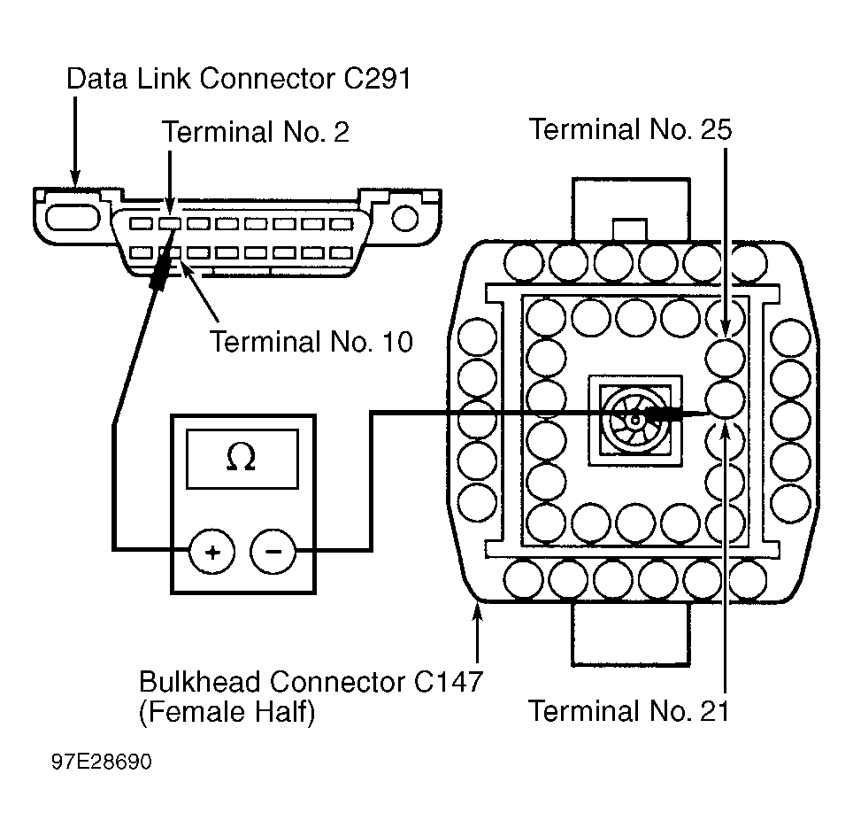 20. Measure resistance of Pink/Light Blue wire between DLC, terminal No. 10 and female half of bulkhead connector C147, terminal No. 25. See Fig 2. If resistance is less than 5 ohms, go to next step. If resistance is more than 5 ohms, repair open in Tan/Orange wire between female half of bulkhead connector and DLC and retest system.