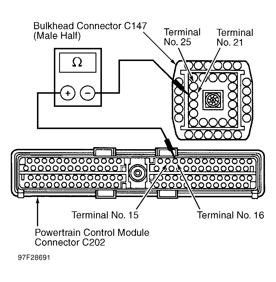 22. Measure resistance of Pink/Light Blue wire between PCM connector C202, terminal No. 15 and male half of bulkhead connector C147, terminal No. 25. See Fig 3. If resistance is less than 5 ohms, reconnect bulkhead connector C147 and go to next step. If resistance is more than 5 ohms, repair open in Pink/Light Blue wire between PCM connector and male half of bulkhead connector and retest system.