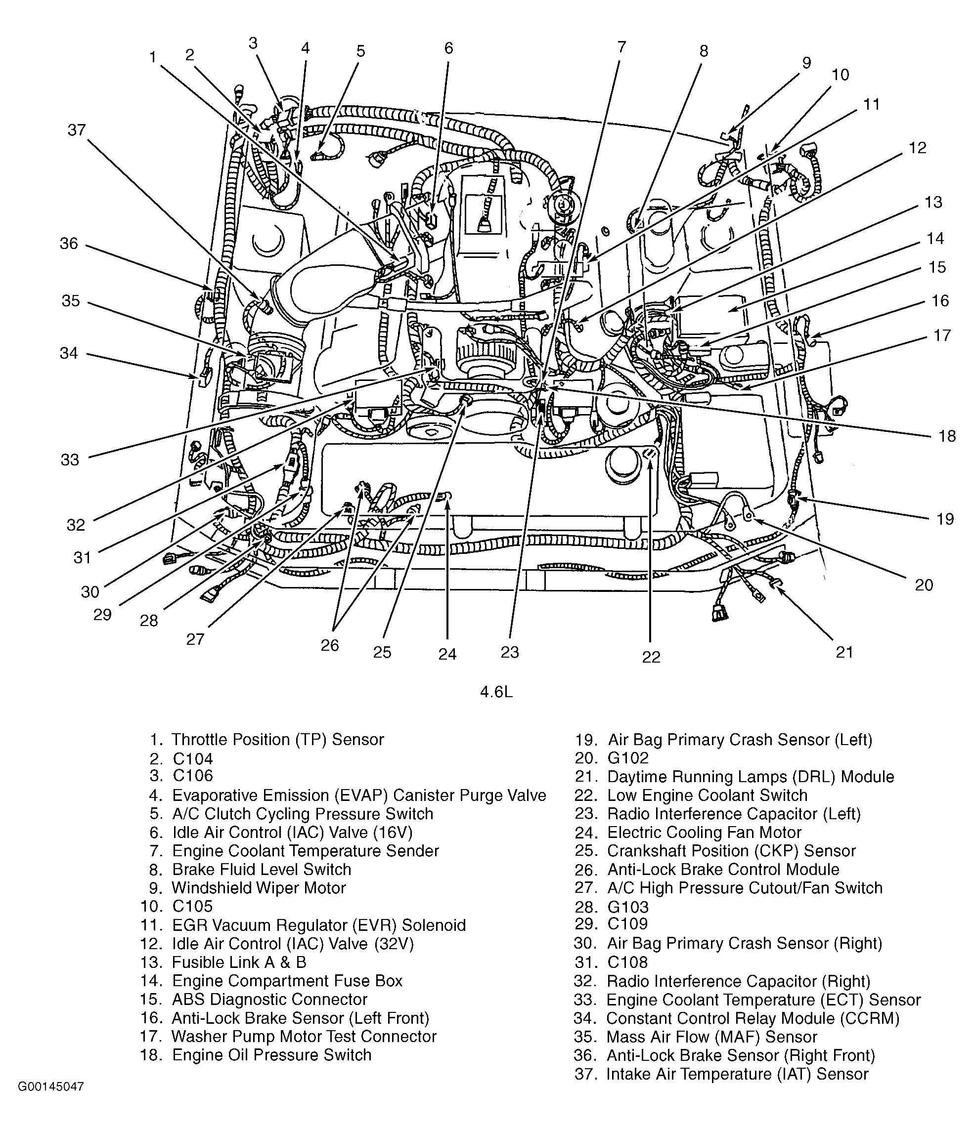 | Daytime Running Lamps (DRL) Module (4.6L) | In left front corner of engine compartment, below horns. See Figure. |
