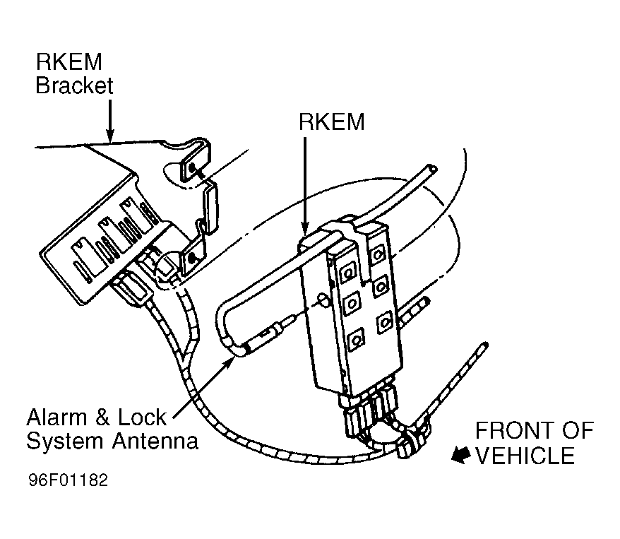 Disconnect negative battery cable. Open glove box. Depress sides of glove box, and lower glove box to access RKEM. Slide RKEM off bracket. See Figure. Unplug harness connectors. Unplug antenna connector. To install, reverse removal procedure.