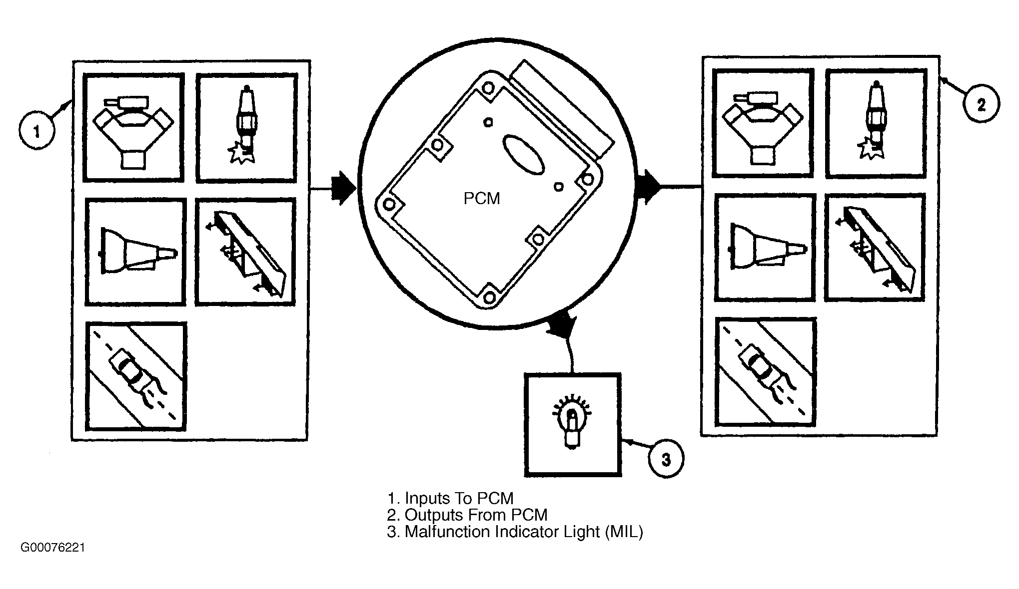 The CCM covers many components and circuits and tests them in various ways depending on the hardware, function, and type of signal. See Fig 1. For example, analog inputs are typically checked for opens, shorts, and out of range values. This type of monitoring is performed continuously. Some digital inputs rely on rationality checks. These tests may require the monitoring of several components and can only be performed under the appropriate test conditions. Outputs are checked for opens and shorts by monitoring the Output State Monitor (OSM) or circuit associated with the output driver when the output is energized or de-energized. Other outputs, such as relays, require additional OSM circuits to monitor the secondary side of the component. Some outputs are also monitored for the proper function by observing the reaction of the control system to a given change in the output command. An example of this would be the Idle Air Control (IAC) solenoid.