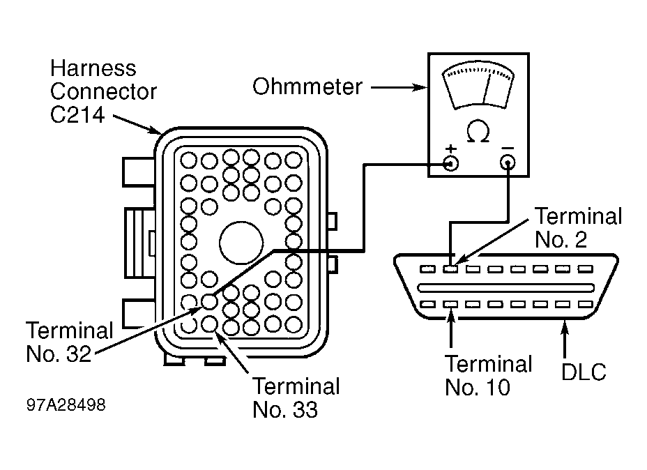 - Using ohmmeter, check resistance between terminal No. 10 (Pink/Light Blue wire) on DLC and terminal No. 33 (Pink/Light Blue wire) on female side of harness connector C214. See Fig 1 . Note resistance and go to next step.