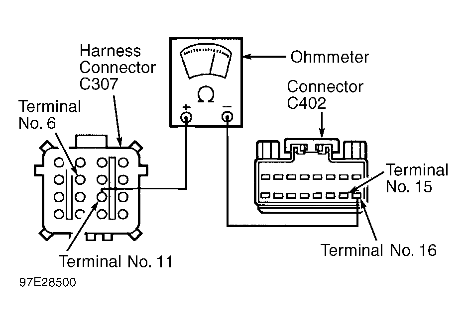 - Using ohmmeter, check resistance between terminal No. 11 (Tan/Orange wire) on male side of harness connector C307 and terminal No. 16 (Tan/Orange wire) on connector C402 for CPM. See Fig 3 . Note resistance and go to next step.