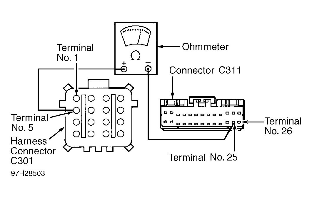 - Using ohmmeter, check resistance between terminal No. 1 (Pink/Light Blue wire) on male side of connector C301 and terminal No. 26 (Pink/Light Blue wire) on connector C311. See Fig 2 . Note resistance and go to next step.