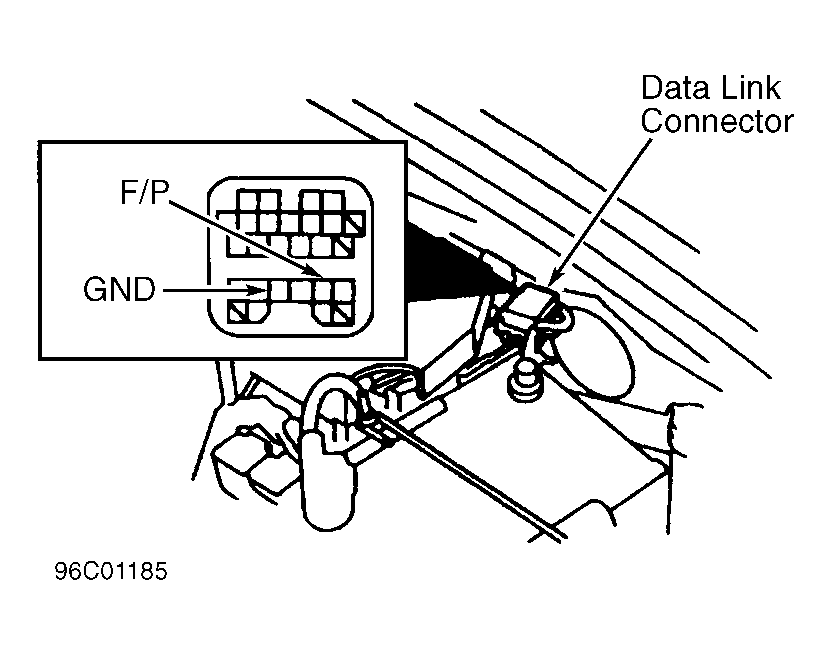 1. Release fuel pressure. See FUEL PRESSURE RELEASE. Install fuel pressure gauge. Connect a jumper wire between fuel pump test terminal at the Data Link Connector (DLC) and ground. See Fig 1 or 2. Turn ignition on, but DO NOT start engine. This activates the fuel pump.