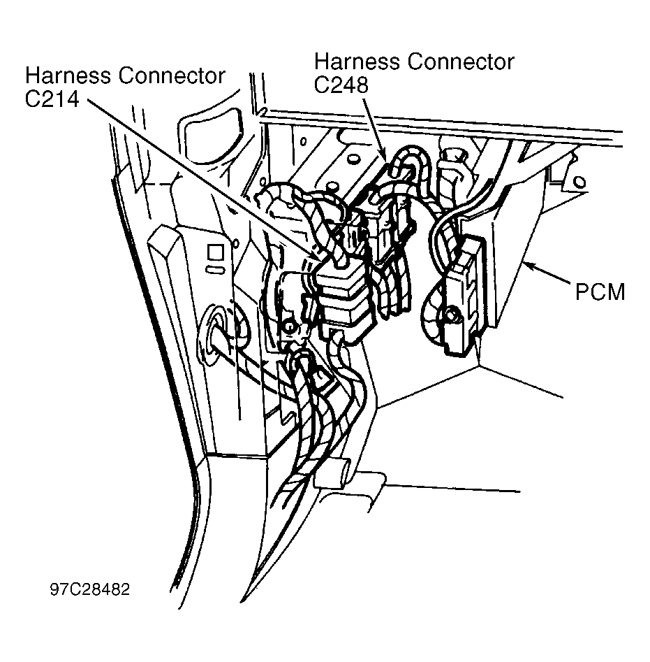 1. Turn ignition switch to OFF position. Disconnect 16-pin harness connector C248. Harness connector C248 is located below driver's side of instrument panel, to the left of steering column. See Figure .