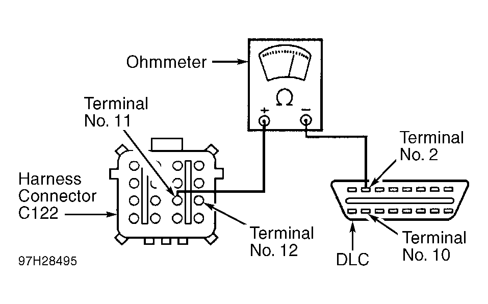 7. Using ohmmeter, check resistance between terminal No. 10 (Pink/Light Blue wire) on DLC and terminal No. 12 (Pink/Light Blue wire) on male side of harness connector C122. See Fig 2 . Note resistance and go to next step.