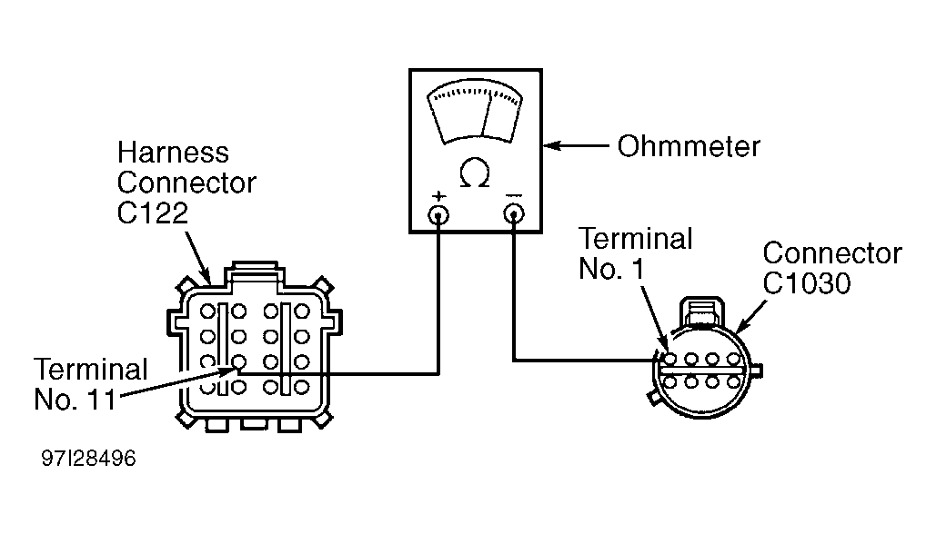 10. Using ohmmeter, check resistance between terminal No. 1 (Tan/Orange wire) on connector C1030 and terminal No. 11 (Tan/Orange wire) on female side of harness connector C122. See Fig 3 .