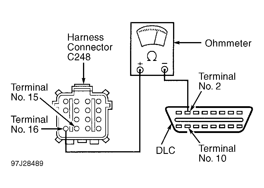 3. Using ohmmeter, check resistance between terminal No. 10 (Pink/Light Blue wire) on DLC and terminal No. 15 (Pink/Light Blue wire) on female side of harness connector C248. See Fig 1 . Note resistance and go to next step.