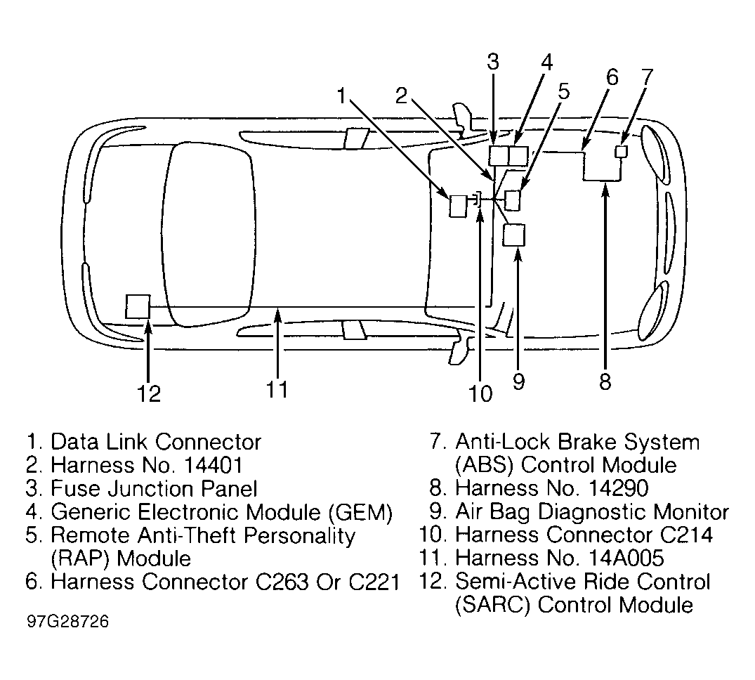 The Generic Electronic Module (GEM), Anti-lock Brake System (ABS) control module, Remote Anti-theft Personality (RAP) module, air bag diagnostic monitor and Semi-Active Ride Control (SARC) module are connected to the ISO 9141 communication link. The ISO 9141 communication link is not a true network in the fact that the modules can only communicate with a scan tool connected to Data Link Connector (DLC) and cannot communicate with the other modules.
