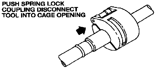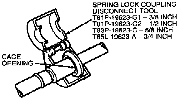 3. Fit Spring Lock Coupling Disconnect Tool T81P-19623-G1 (3/8 inch), T81P-19623-G2 (1/2 inch), T83P-19623-C (5/8 inch) or T85L-19623-A (3/4 inch) to the coupling.