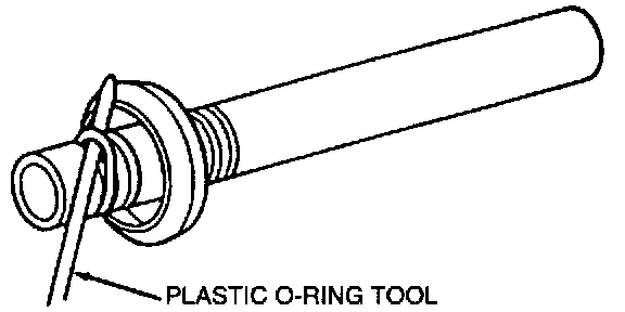 4. Remove the green O-ring seals from the male fitting using Plastic O-ring Tool F5VH-17B017-AA or equivalent. Do not use a metal O-ring tool or other type of metal tool such as a screwdriver, pick, etc. They could cause axial scratches across the O-ring grooves resulting in refrigerant leaks.