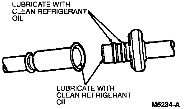 6. Lubricate male fitting, green O-ring seals and inside of female fitting with clean Motorcraft YN-12b refrigerant oil or equivalent meeting Ford specification WSH-M1C231-B.
