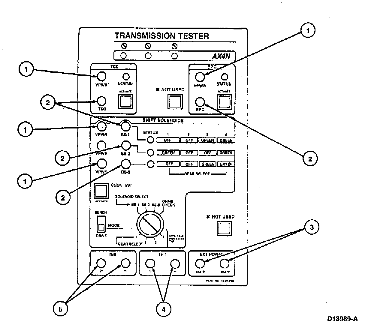 The Rotunda Transmission Tester 007-00130 and Rotunda AX4N Cable and Overlay 007-00117 and Rotunda AX4N Transmission Tester Update 007-00105 or equivalent allow a technician to operate the electrical portion of the transaxle independent of the vehicle electronics to determine specific transaxle concerns. The transmission tester usage is divided into five steps:
