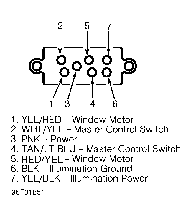 - With window switch in neutral position, there should be continuity between pins No. 1 (Yellow/Red wire) and No.3 (Pink wire), No. 2 (White/Yellow wire) and No. 5 (Red/Yellow wire), and between No. 4 (Tan/Light Blue wire) and No. 6 (Black wire). See Fig 1 .
