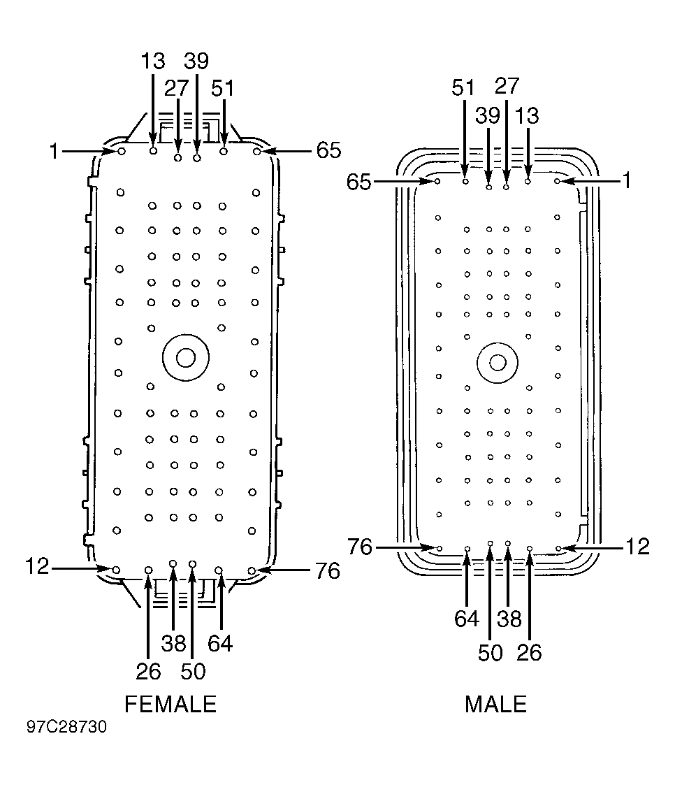 Turn ignition off. Disconnect harness connector C101 (70-pin connector located on left side of firewall). See Figure and Figure. Measure resistance of circuit No. 70 (Light Blue/White wire) between C101 terminal No. 61 and DLC terminal No. 7. If resistance is less than 5 ohms, go to next step. If resistance is greater than 5 ohms, repair open circuit No. 70 (Light Blue/White wire). Repeat DATA LINK DIAGNOSTICS under COMMUNICATION NETWORK DIAGNOSTICS  to confirm repair.