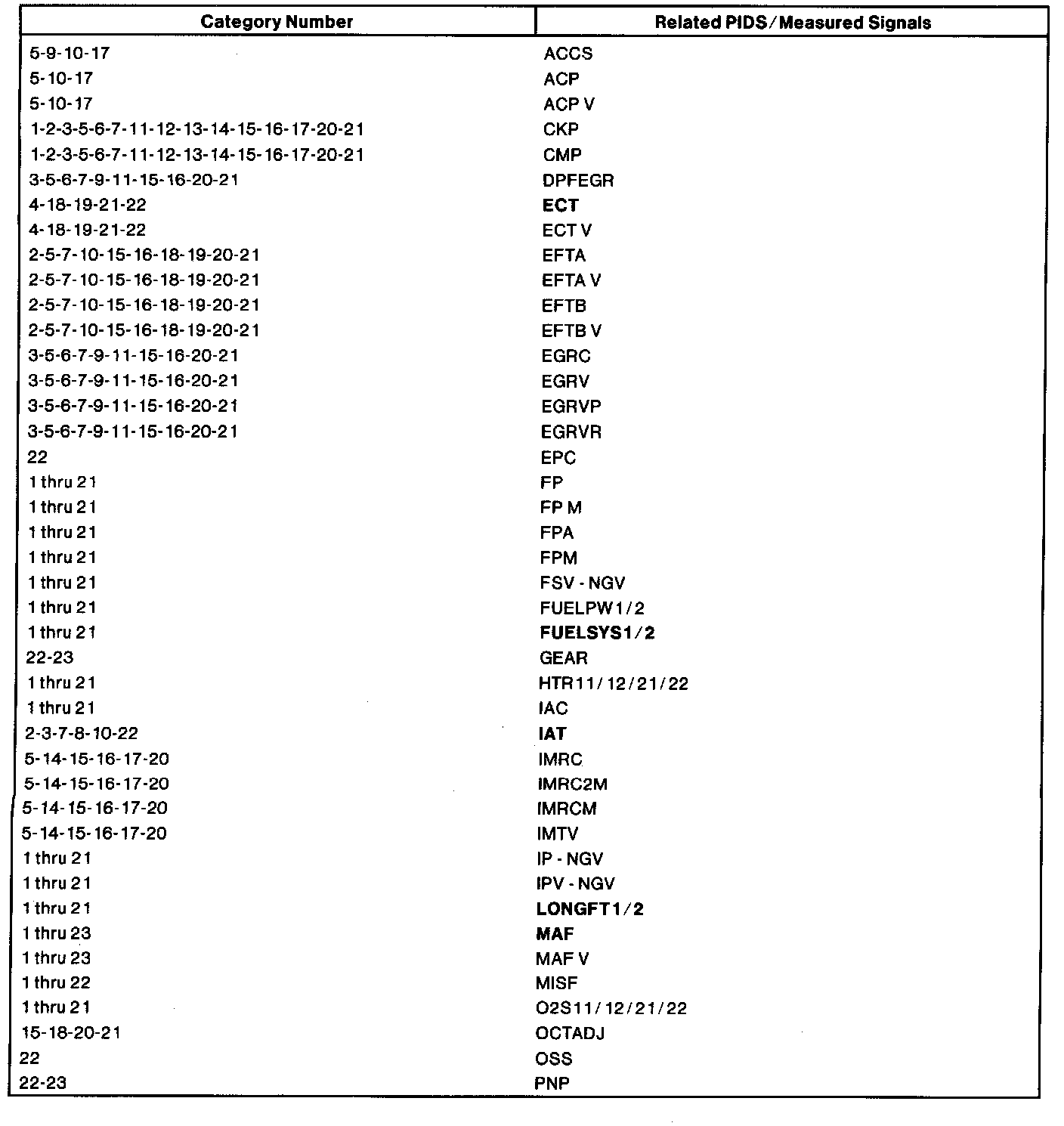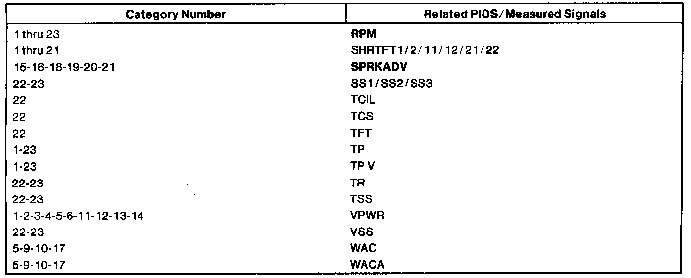 The listing reflects PIDs and/or measured values which may reveal a possible concern within each system shown. Match the category number with the related PID/measured signal and proceed to the Typical Diagnostic Reference Value Charts.NOTE: