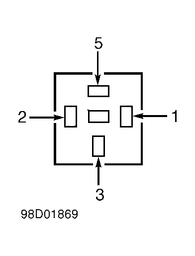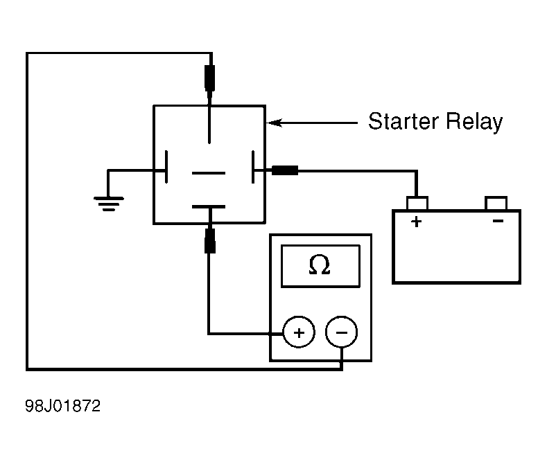 Turn ignition off. Remove starter relay. Connect a jumper wire between positive battery terminal and starter relay terminal No. 2. See Fig 3 . Connect another jumper wire between negative battery terminal No. 1 and ground. Measure resistance between starter relay terminals No. 5 and 3. If resistance is less than 5 ohms, go to step 14). If resistance is greater than 5 ohms, replace relay. Restore electrical connections and check system operation.