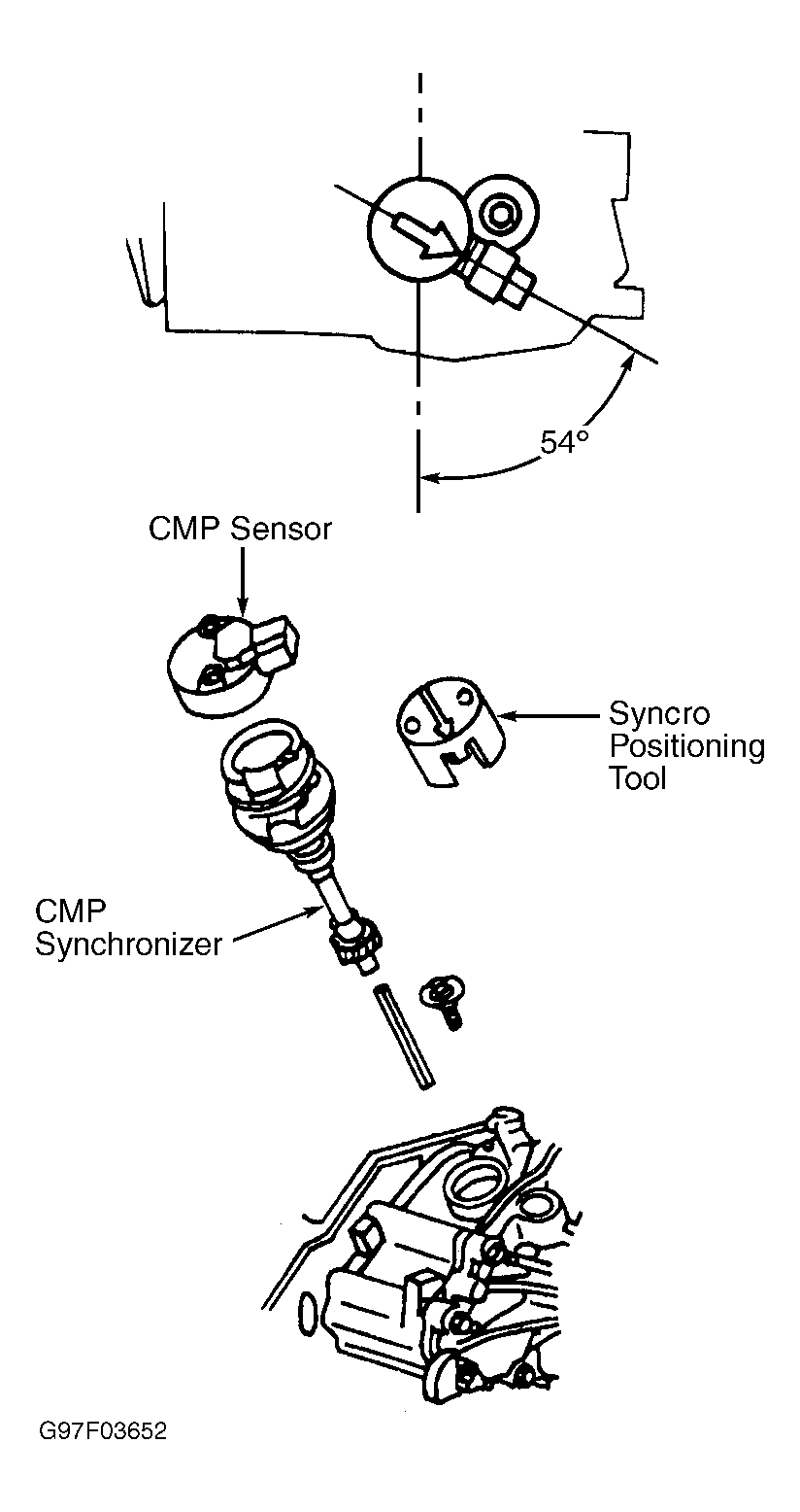 - Install the Syncro Positioning Tool (T96T-12200-A) on the camshaft synchronizer by rotating the tool until it engages the notch in the camshaft synchronizer housing. See Figure. During installation, the arrow on the syncro positioning tool will rotate clockwise as the gears engage. Install the camshaft synchronizer housing assembly so the arrow on the synchronizer alignment tool is 54 degrees from the centerline of the engine.