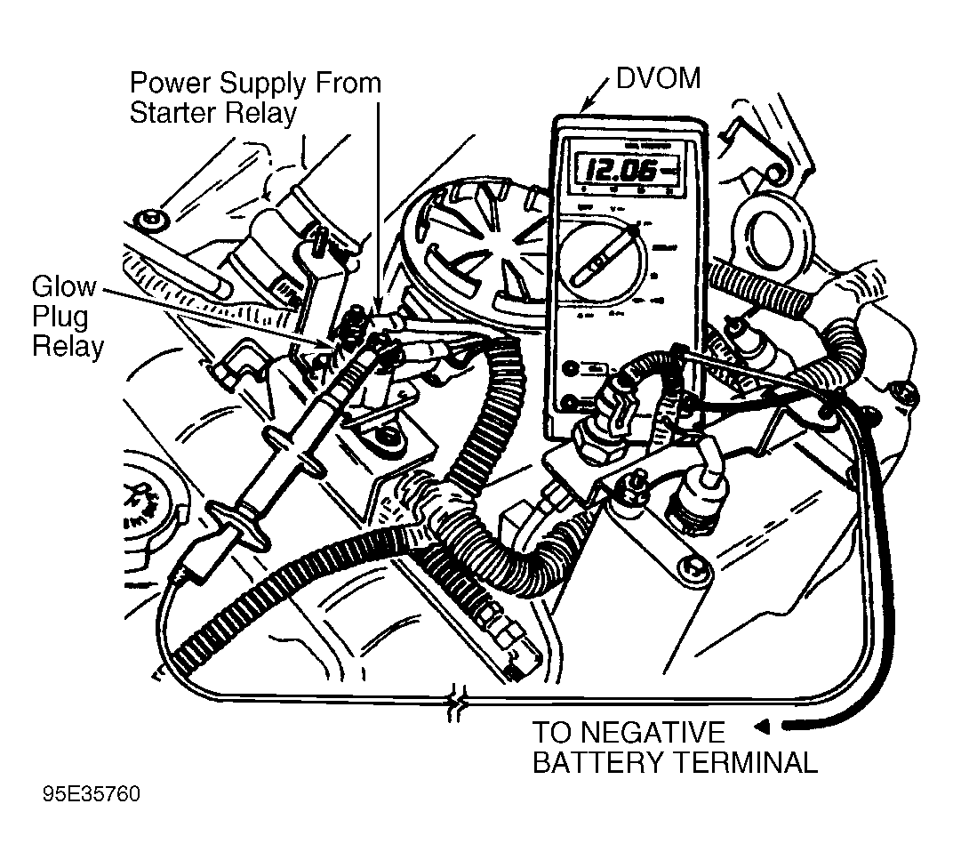 - Connect a DVOM between ground and Black/Orange wire at glow plug relay. See Fig 1 . Turn ignition on. If battery voltage is present, go to next step. If battery voltage is not present, locate and repair open circuit in Black/Orange wire between glow plug relay and starter relay.