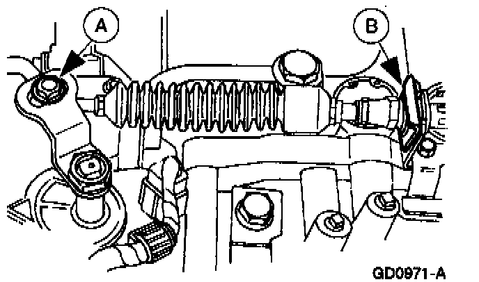 3. Remove the (A) shift cable and bracket nut and the (B) control cable front clamp.