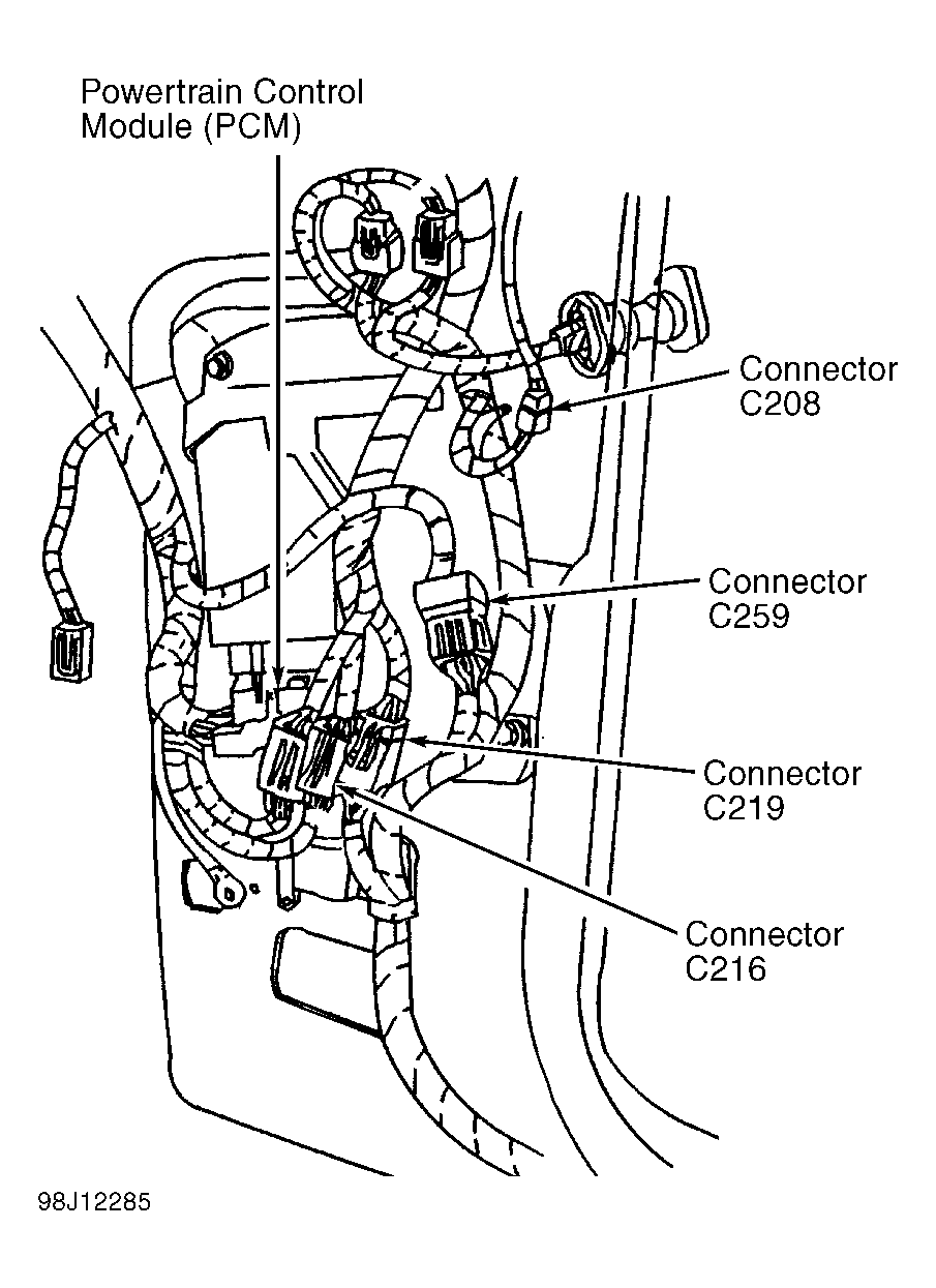 - Disconnect Black 12-pin connector C216 located behind right side of instrument panel. See Figure . Inspect connector for loose, damaged or corroded terminals. Repair connector as necessary and retest system for normal operation. If connector is okay, turn ignition on. Measure voltage between terminal No. 4 (Black wire) and terminals No. 2 (Tan/Orange wire) and No. 10 (Pink/Light Blue wire) at DLC. If any reading indicates voltage, repair Tan/Orange wire and/or Pink/Light Blue wire between DLC, PATS module and female half of connector C216. Retest system for normal operation. If both readings indicate zero volts, repair Tan/Orange wire and/or Pink Light Blue wire between male half of connector C216 and PCM. Retest system for normal operation.